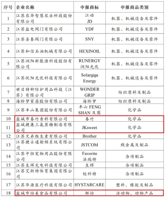 近日,江蘇省商務(wù)廳發(fā)布2023—2025年度江蘇省重點培育和發(fā)展的國際知名品牌名單,在鹽城市獲牌的18家企業(yè)中,射陽縣僅3家,其中鹽城捷康三氯蔗糖制造有限公司作為射陽標(biāo)桿企業(yè)上榜。